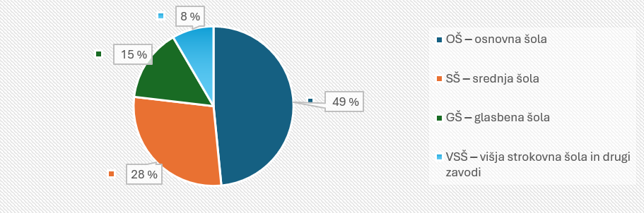 Kot je razvidno iz grafa 1, je bilo med njimi največ osnovnih šol (48,4 %), sledijo srednje šole (28,4 %), glasbene šole (14,7 %) in na koncu še višje strokovne šole (8,4 %), ki delujejo v okviru srednješolskih centrov, in drugi zavodi. Zanimiv je delež obdelanih enot za posamezne šole (graf 2): največ gradiva smo obdelali za glasbene šole (70,3 %), sledijo osnovne šole (17,1 %), srednje šole (6,6 %) ter višje strokovne šole, ki delujejo v okviru srednješolskih centrov, in drugi zavodi (6 %).